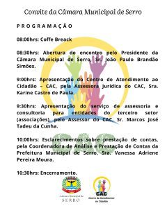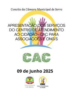 A Câmara Municipal de Serro convida as organizações da sociedade civil, associações comunitárias e lideranças locais e representantes do Poder Público para a Apresentação do Centro de Atendimento ao Cidadão (CAC) – um espaço dedicado a facilitar o acesso da população e das entidades ao poder público, promovendo cidadania, inclusão e transparência.